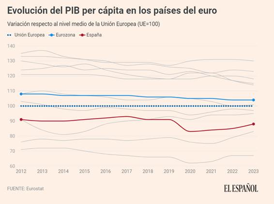 Si en 2007 el PIB per cápita español estaba en el 91% de la media europea, en 2023 había caído al 88%, con la eurozona en el 104% (es decir, por encima del promedio comunitario).