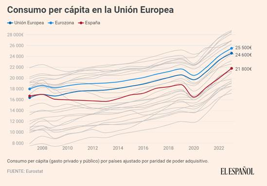 La estadística de consumo per cápita de Eurostat —que la oficina estadística europea define como un indicador del bienestar material de los hogares— sitúa el gasto de los españoles en 21.800 euros en 2023. La media para el conjunto de la Unión Europea está en 24.600 euros, y en la zona euro escala hasta los 25.500 euros.