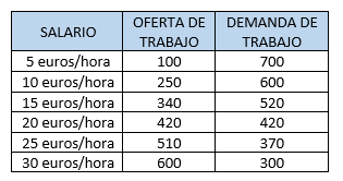Tanto en la tabla como en el gráfico podemos ver que la oferta y la demanda de trabajo se cortan para un salario de 20 euros a la hora. A ese salario se contratarán 420 trabajadores que son exactamente los que desean trabajar, por tanto, el desempleo será igual a cero.