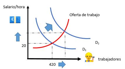 Se produce por tanto un desplazamiento a la derecha de la curva de demanda de trabajo. Como ves, un aumento de productividad llevar a un mayor salario y a una mayor contratación de trabajadores. Es por tanto una situación muy beneficiosa para el país