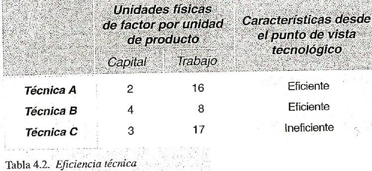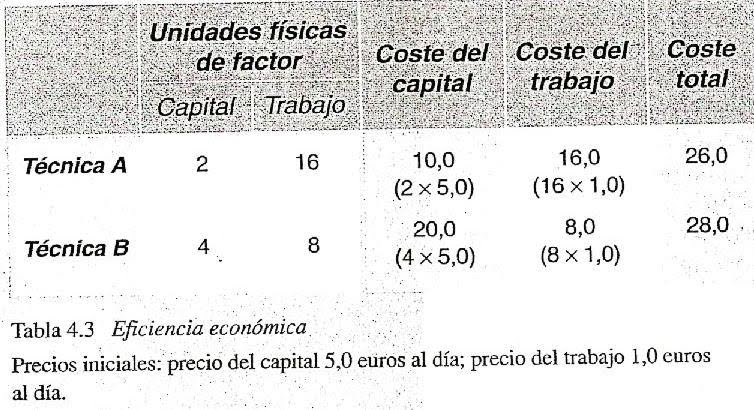 La técnica A emplea menos unidades de capital que la B, pero requiere más unidades de trabajo por unidad de producto empleada: en consecuencia, desde un punto de vista estrictamente tecnológico ambas son eficientes y la empresa no puede elegir entre ellas. Sin embargo, la técnica C emplea más cantidad de ambos factores que la técnica A, y no será elegida en ningún caso o, lo que es lo mismo, es ineficiente. Pero el criterio de eficacia técnica no nos permite escoger entre los métodos A y B. Para poder hacer esto, necesitamos la información que proporcionan los precios de Ios factores.