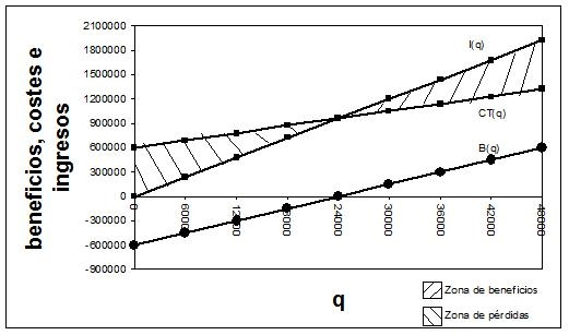 Efectivamente, como se puede apreciar en el gráfico anterior, si la empresa produce menos de 24000 unidades incurre en pérdidas: