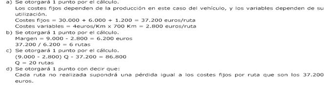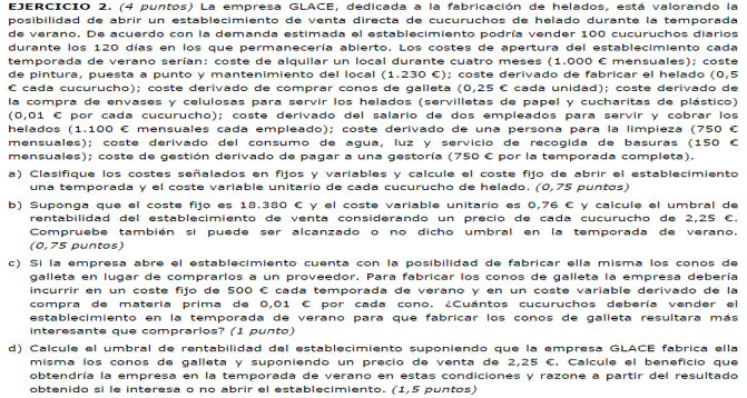 Ej 10.- Obtén los costes fijos de una empresa que este año ha incurrido en unas pérdidas de 2000 euros vendiendo 100 unidades con un margen unitario de 4 euros.