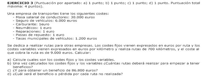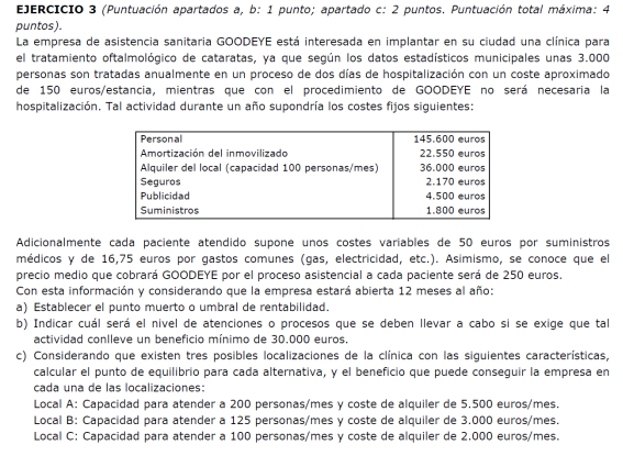 Ej 9.- Obtén el coste unitario de una empresa sabiendo que este año ha alcanzado su umbral de rentabilidad vendiendo 200 unidades a un precio de 60 euros, incurriendo en unos costes fijos de 3000 euros.