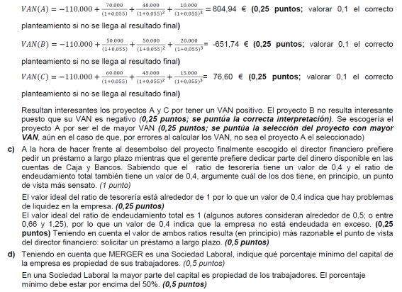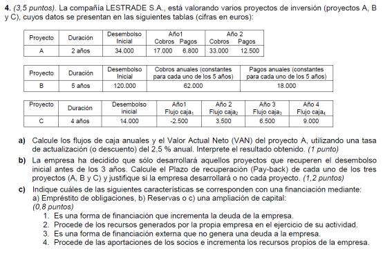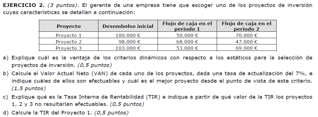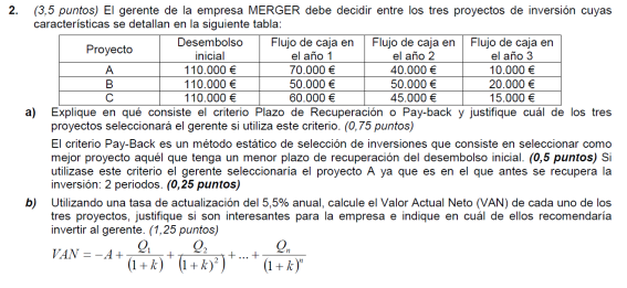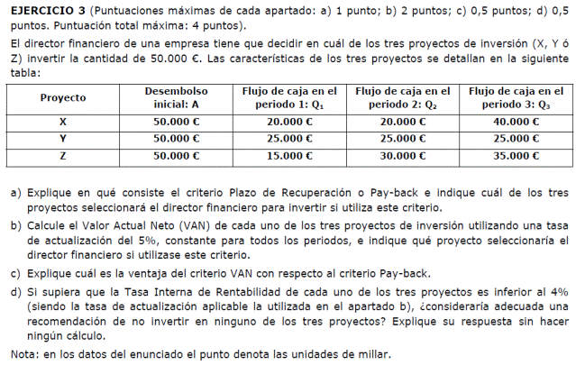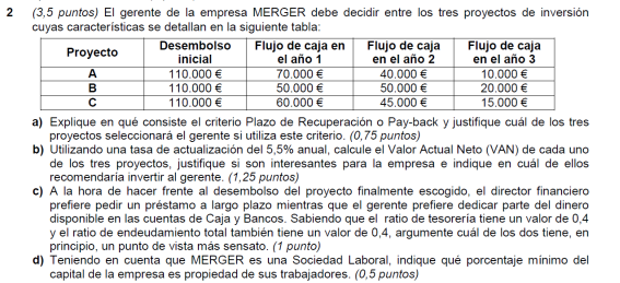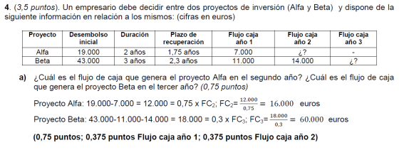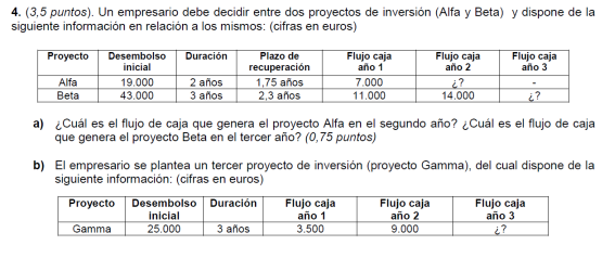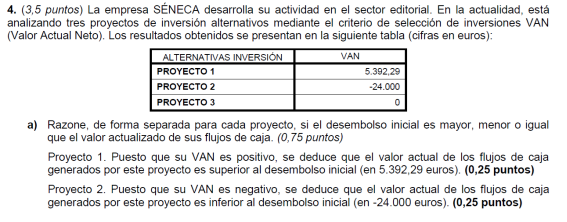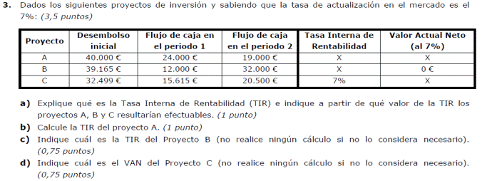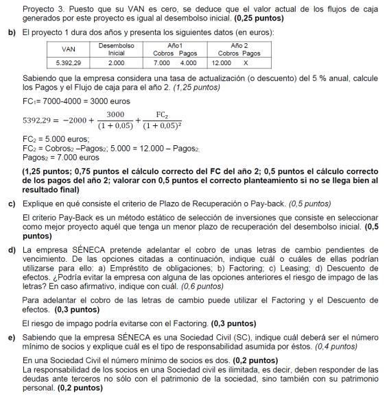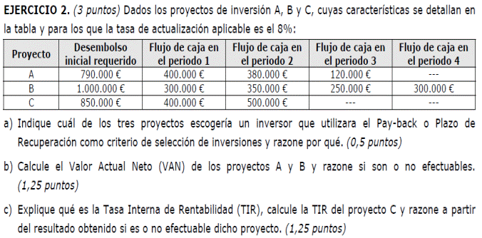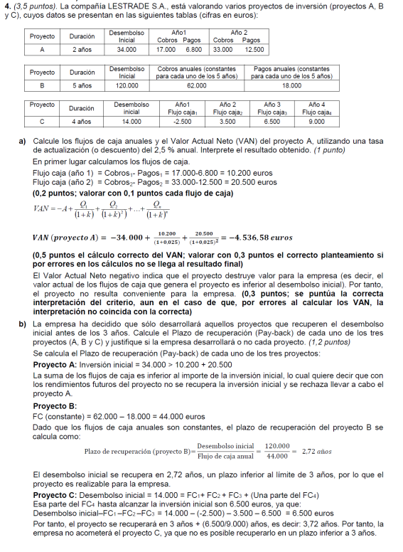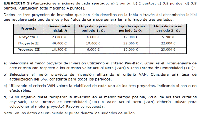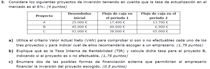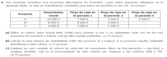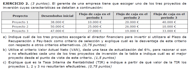 Tasa de inflación ( r): 10 %; plazo máximo de recuperación: 4 años y recursos financieros disponibles: 5.000€; En todos los proyectos la Inversión Inicial asciende a 2.500 € (2,5 puntos)