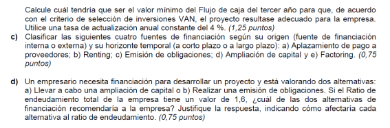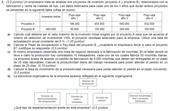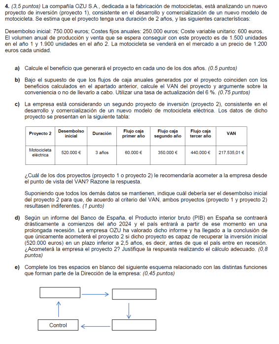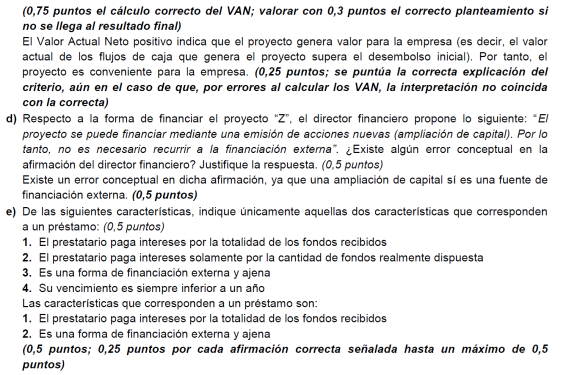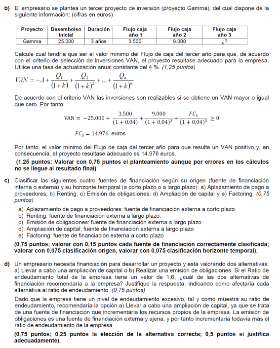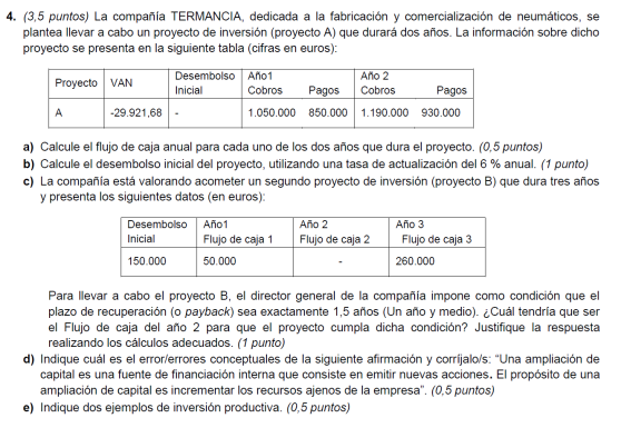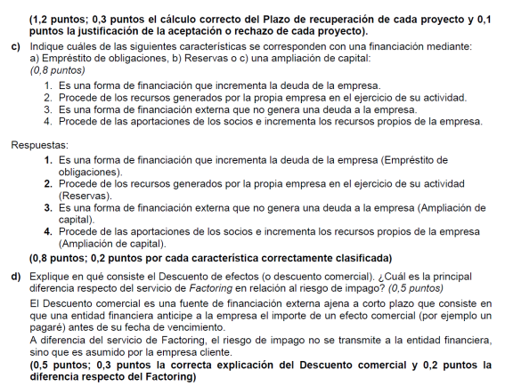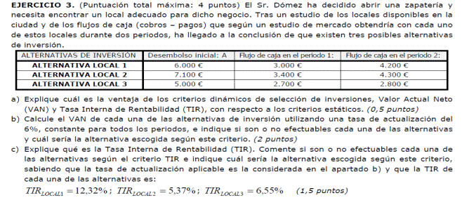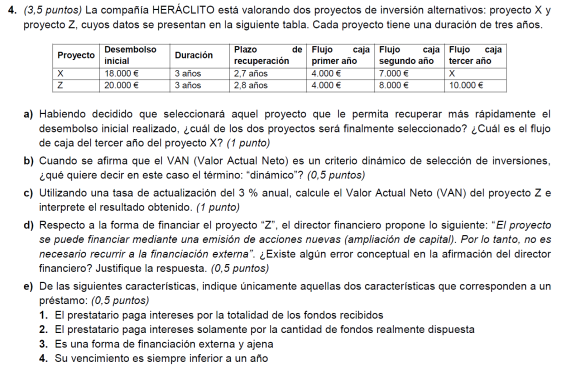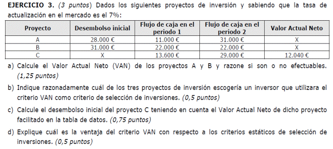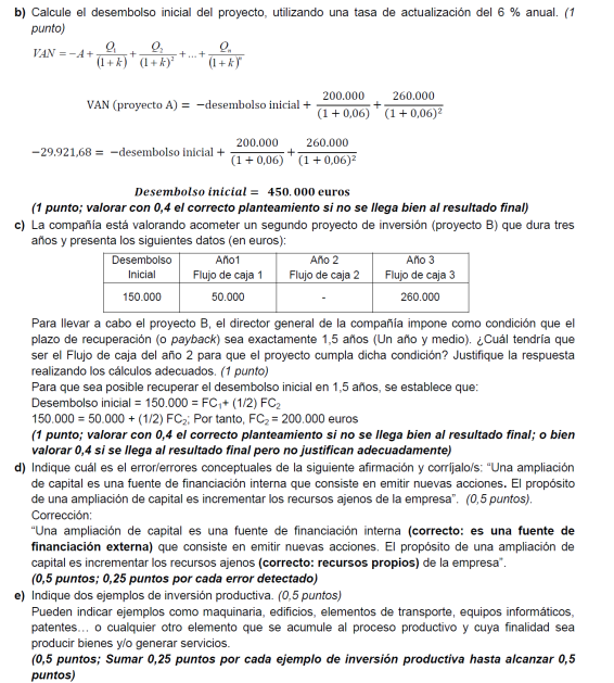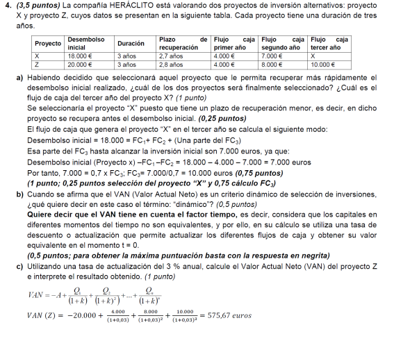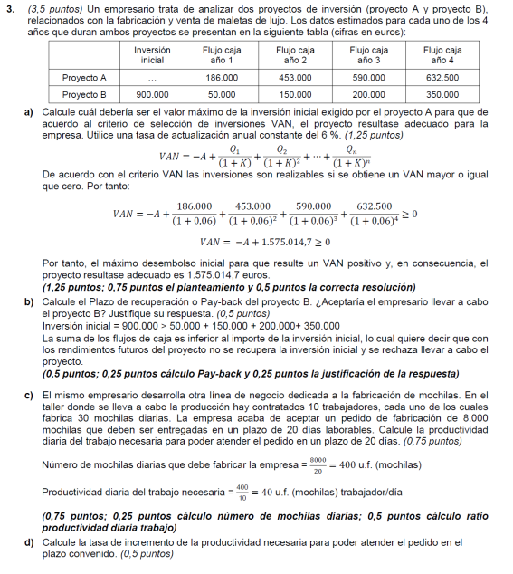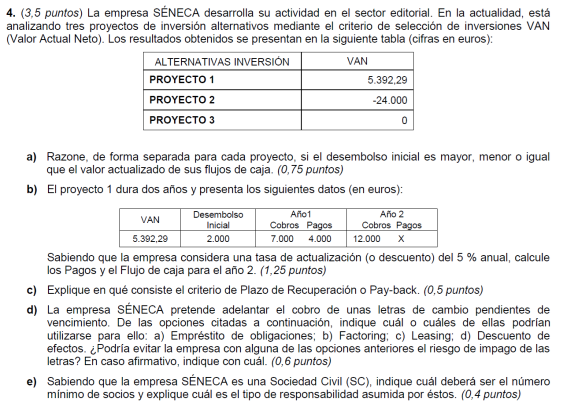 Tasa de inflación ( r): 10 %; plazo máximo de recuperación: 4 años y recursos financieros disponibles: 5.000€; En todos los proyectos la Inversión Inicial asciende a 2.500 € (2,5 puntos)