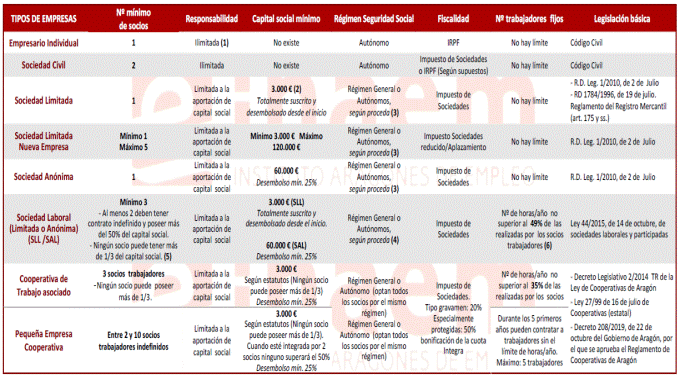 | Tipo de empresa | Nº socios | Capital | Responsabilidad |