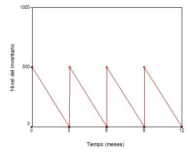 Un modelo clásico que sirve para representar la evolución temporal de los inventarios es la gráfica de dientes de sierra, donde en el eje de ordenadas se representa el nivel de inventario y en el eje de abscisas el tiempo. En el siguiente gráfico se supone que el tamaño del lote es 500 y el punto de reorden es cero, es decir, se hace un nuevo pedido (de 500 unidades) cuando el almacén se vacía, lo que sucede, en este hipotético caso, cada tres meses.
