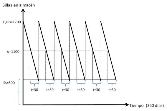 Cuando el nivel de existencias baja hasta el punto de pedido se gestiona un nuevo pedido siempre del mismo tamaño (Q). Mientras transcurre el plazo de aprovisionamiento el nivel de existencias ha bajado hasta el stock de seguridad.