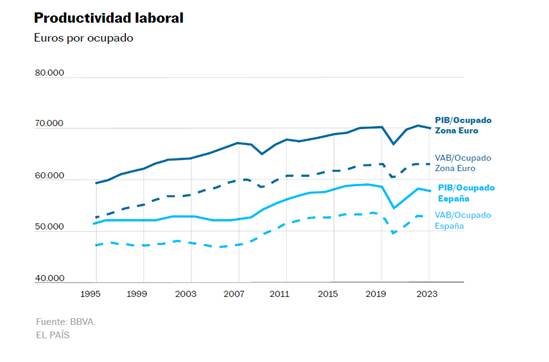 Al margen de la revisión de la productividad española a escala europea, el estudio reconoce algunas luces singulares en el comportamiento del mercado laboral nacional en los últimos años. “Tanto el valor añadido por hora como por trabajador han avanzado más en España que en la UEM en el bienio 2022-2023″, apunta el documento. “En 2020, la productividad laboral por ocupado cayó como consecuencia, entre otros factores, de los programas de retención del empleo, como los ERTE, pero el VAB por hora trabajada no se resintió.