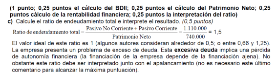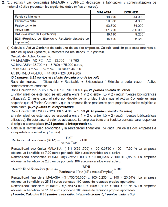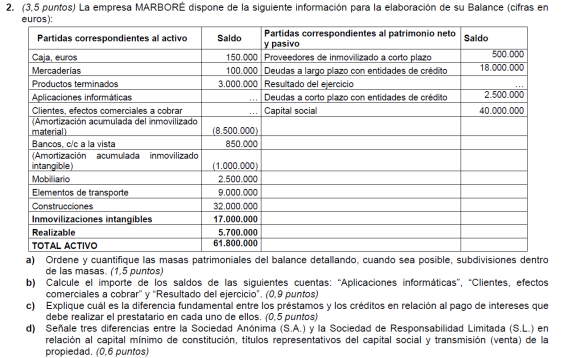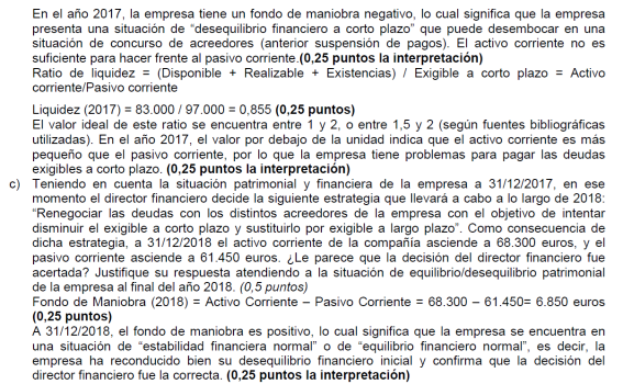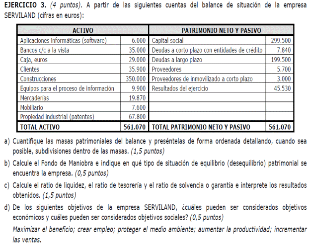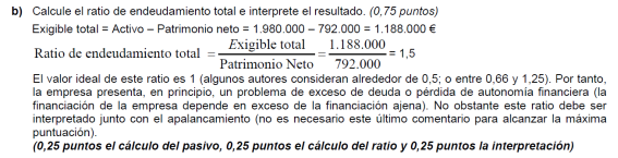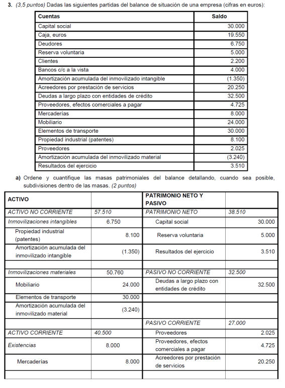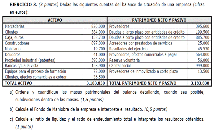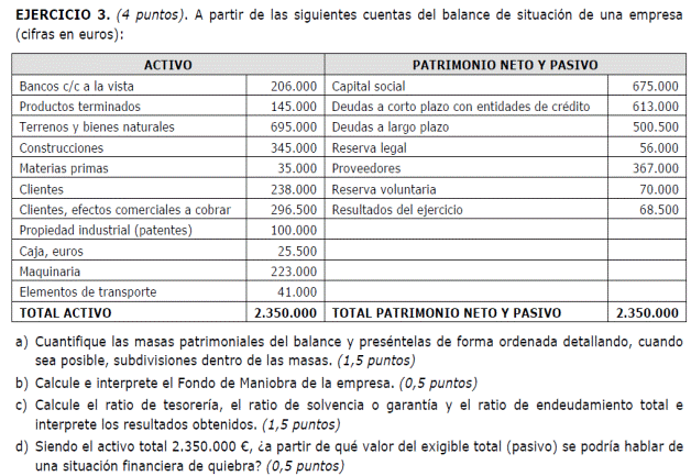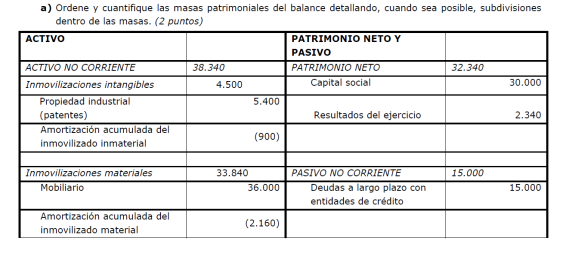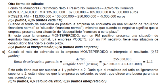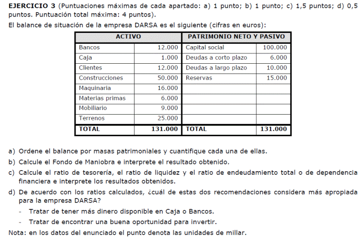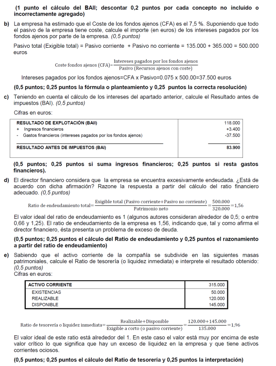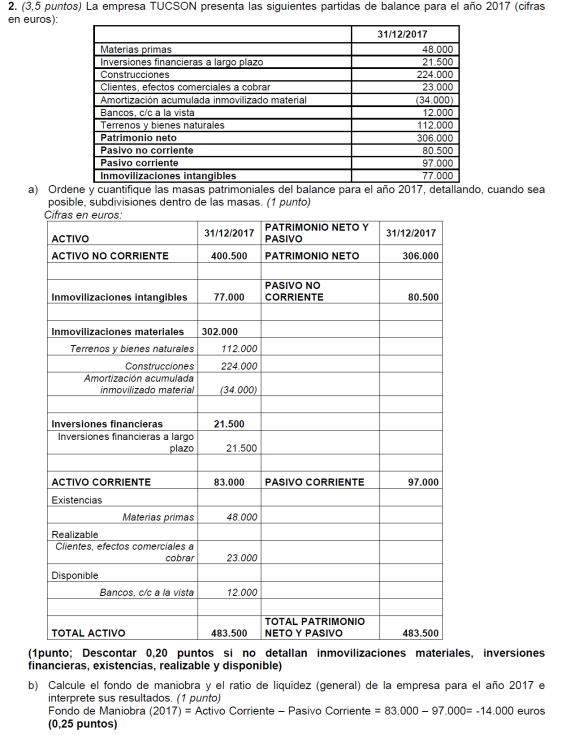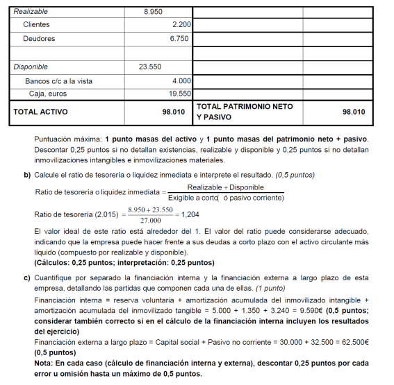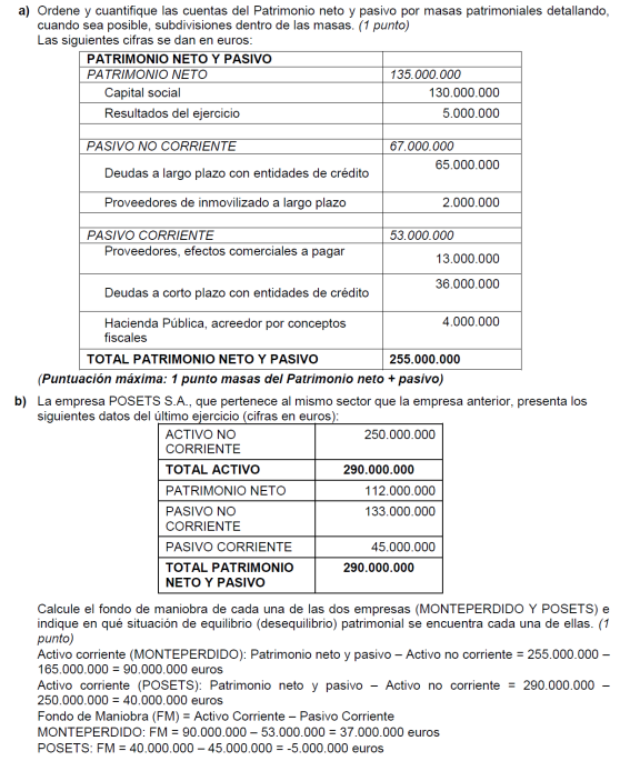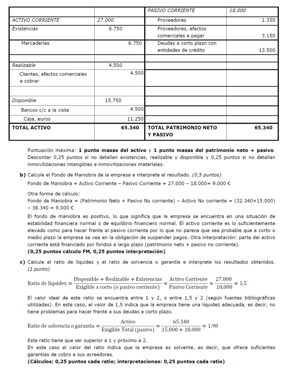 a) Es suficiente con presentar un balance sencillo (basta, por ejemplo, con tres o cuatro partidas de activo y otras tantas de pasivo). Para alcanzar la máxima puntuación es necesario que la suma de las partidas del activo coincida con la suma del pasivo y que el fondo de maniobra sea negativo. No basta con presentar un balance en el que en el activo sólo se distingue entre activo/pasivo fijo y circulante (no son realmente partidas de un balance). Una posible solución para mejorar la situación puede ser una renegociación de la deuda con los proveedores, o la transformación de deudas a corto plazo en deudas a largo (un punto por un balance adecuado y 0,5 por ofrecer una medida correctora).