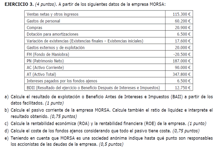 b) Elabore el balance de una hipotética empresa que se encuentre en situación de quiebra (Es suficiente con que contenga cuatro partidas de activo y otras tantas de pasivo). Señale qué medidas debería adoptar dicha empresa si desea continuar su actividad.
