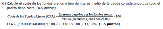 Dado un coste de los fondos ajenos nulo, la rentabilidad económica (RE=18.75%>CFA=0%) un incremento del endeudamiento generaría un efecto apalancamiento positivo, que incrementaría la rentabilidad financiera final obtenida. |