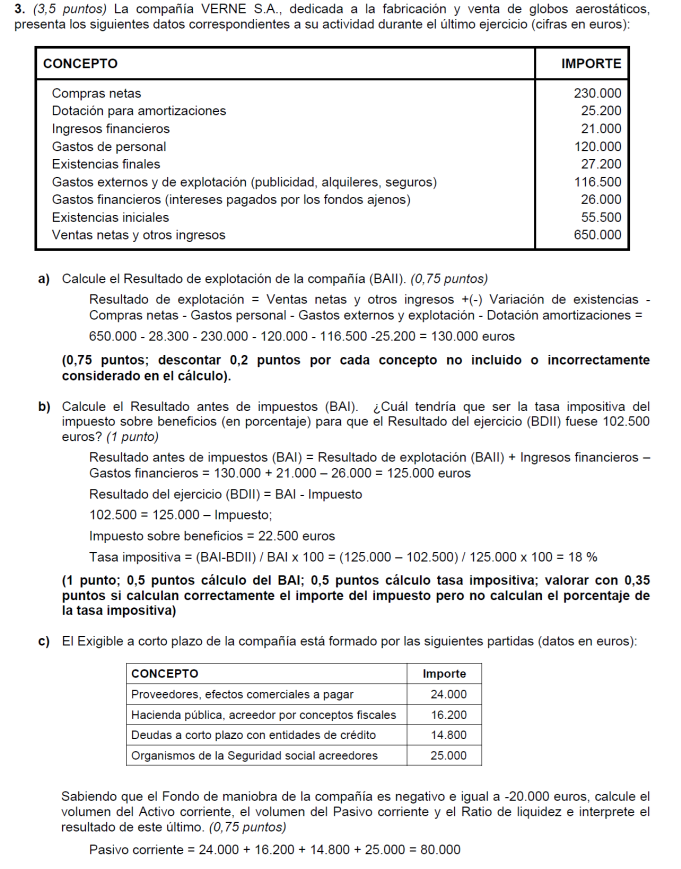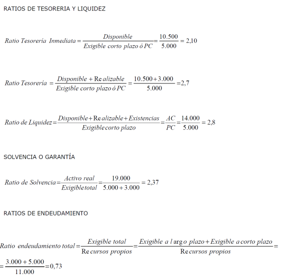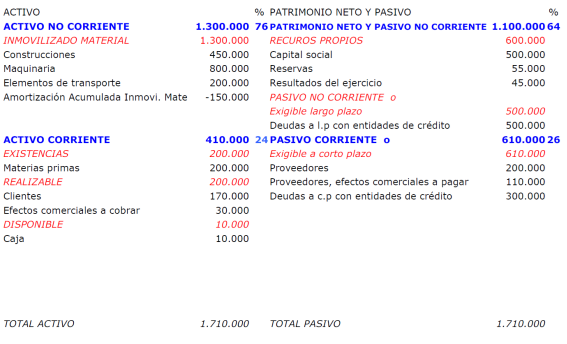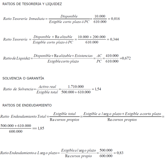 No existe Activo ficticio. El pasivo total asciende a 100.000.000 de pts. Ratio de inmovilizado = 1,25. Rentabilidad económica = 15%. Financiación Básica o Capitales permanentes = 71.685.000. Exigible a LP = 2.000.000. Los Recursos Propios se componen de Capital Social y Reserva Legal, siendo el importe de ésta el mínimo exigido por la Ley de SA., El coste de la deuda a largo plazo es el 5%. Esta empresa tiene registradas unas patentes por valor de 1.750.000. La composición del activo circulante es: Disponible/A.C. = 0,5; Realizable/A.C. = 0,25; Existencias/A.C. = 0,25. El impuesto de sociedades (35%) no ha sido todavía pagado.