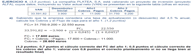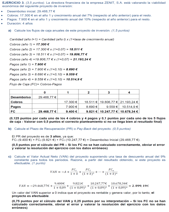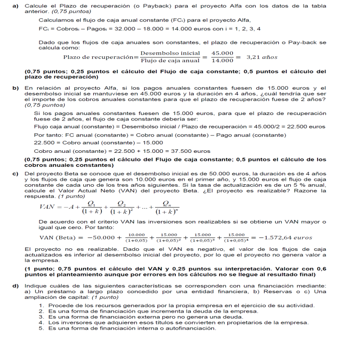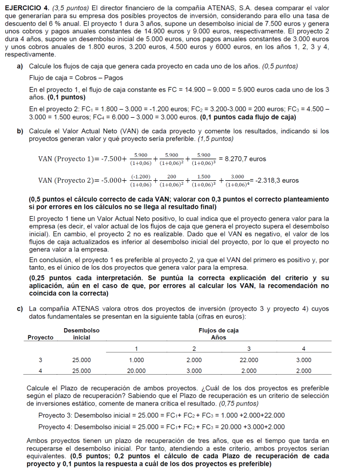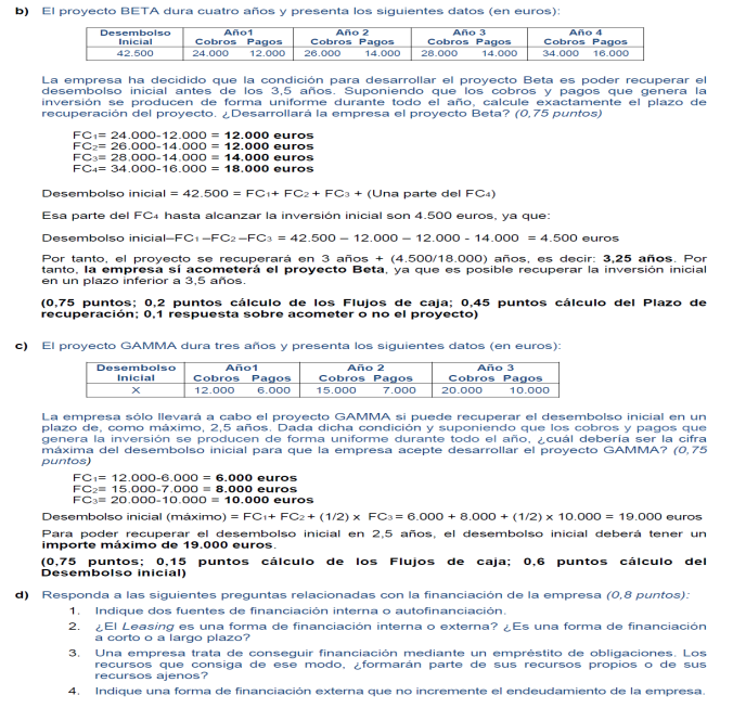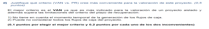 Tasa de inflación ( r): 10 %; plazo máximo de recuperación: 4 años y recursos financieros disponibles: 5.000€; En todos los proyectos la Inversión Inicial asciende a 2.500 € (2,5 puntos)