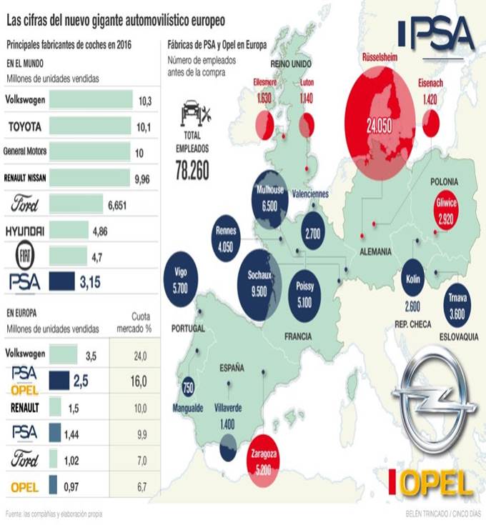 Sin cierre de plantas  Fiat Chrysler y PSA calculan que el 80% del ahorro se logrará en un plazo de cuatro años, aunque anotarán una carga de 2.800 millones relacionada con las sinergias y el proceso de reducción de costes. No obstante, los fabricantes, que suman unos 400.000 empleados en todo el mundo, aseguraron que la fusión no supondrá el "cierre de fábricas". PSA es el mayor fabricante de vehículos en España, donde cuenta con tres factorías (Vigo, Figueruelas y Villaverde), pero FCA no tiene plantas.