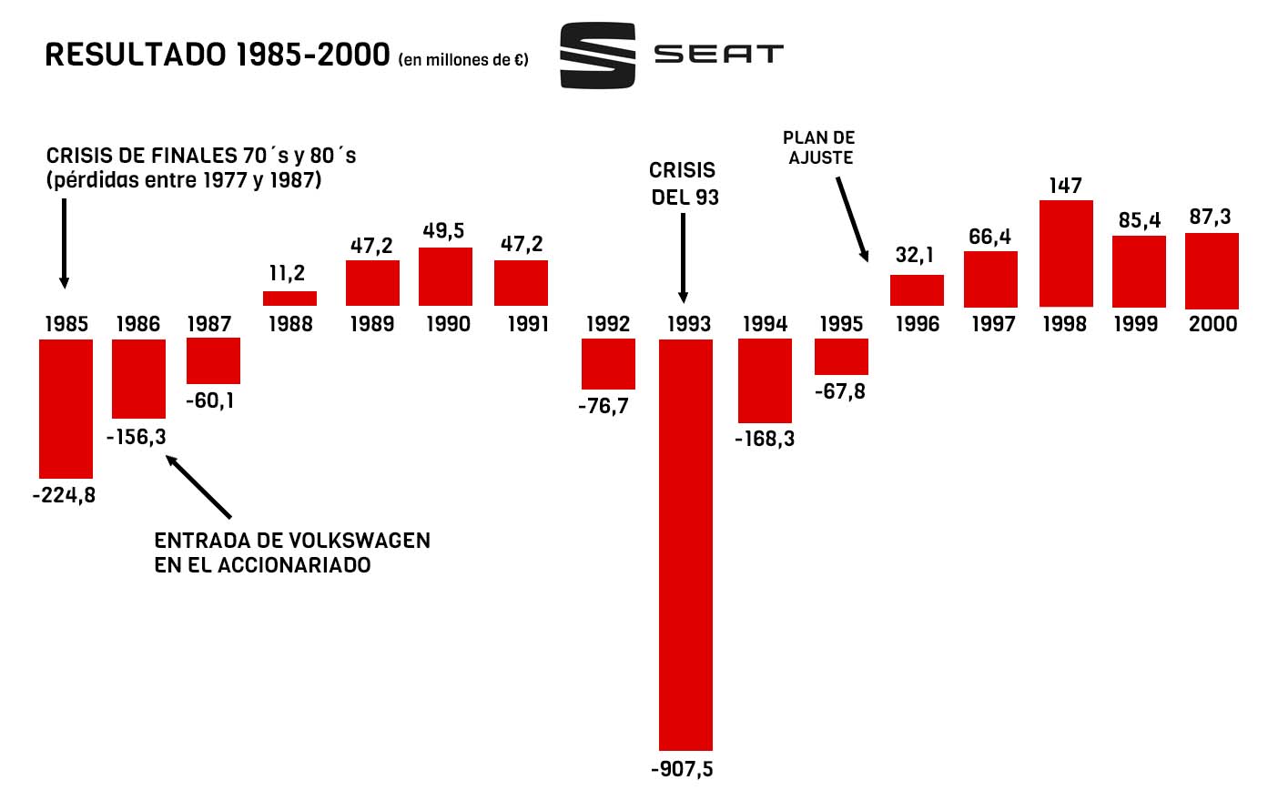 En 1988, tras dos años de gestión de Volkswagen, la empresa española vuelve a ofrecer resultados positivos, presentando un beneficio de 1.860 millones de pesetas (11,2 millones de euros). Recordemos que SEAT llevaba ofreciendo pérdidas en los últimos 10 años (desde 1977).