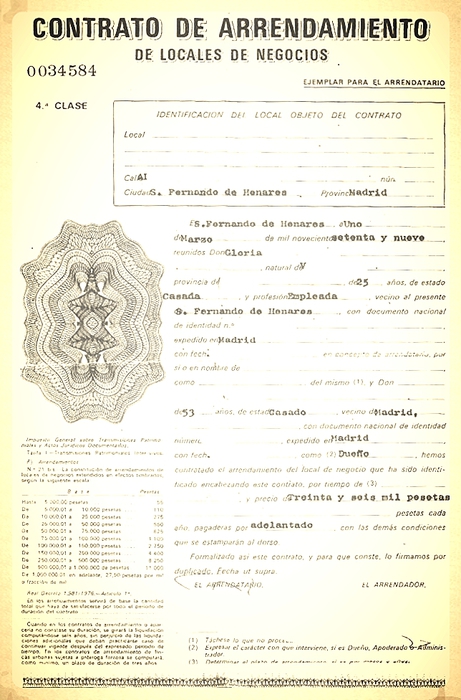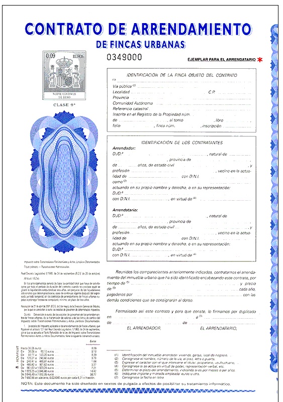En todo caso es posible su otorgamiento mediante documento privado, fechado y firmado por las partes, para lo cual existen impresos oficiales que el estado tiene a la venta en los estancos, como papel timbrado, cuyo precio varía en función del importe total de las rentas que satisfará el arrendatario en el período de duración del contrato, de acuerdo con la escala prevista en el Real Decreto Legislativo 1/1993, de 24 de septiembre, por el que se aprueba el Texto Refundido del Impuesto sobre Transmisiones Patrimoniales y Actos Jurídicos Documentados, de modo que, mediante su adquisición, se satisface la consiguiente deuda tributaria. A este impreso se le añadirán, si así lo desean las partes, las hojas necesarias para el establecimiento de las cláusulas especiales que habrán de aplicarse durante la vigencia del contrato.