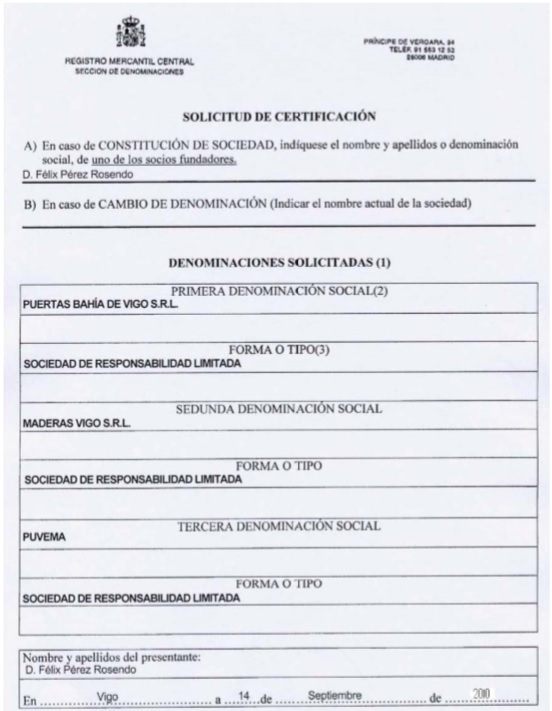 Se puede solicitar directamente en las oficinas del Registro Mercantil Central, con un impreso de solicitud de certificación, por correo a las oficinas del Registro Mercantil Central en Madrid (C/ Príncipe de Vergara, 94), también la instancia oficial con la denominación elegida, se puede realizar a través de Internet en www.rmc.es. El registro contestará remitiendo la certificación contra reembolso a la dirección indicada en la solicitud.