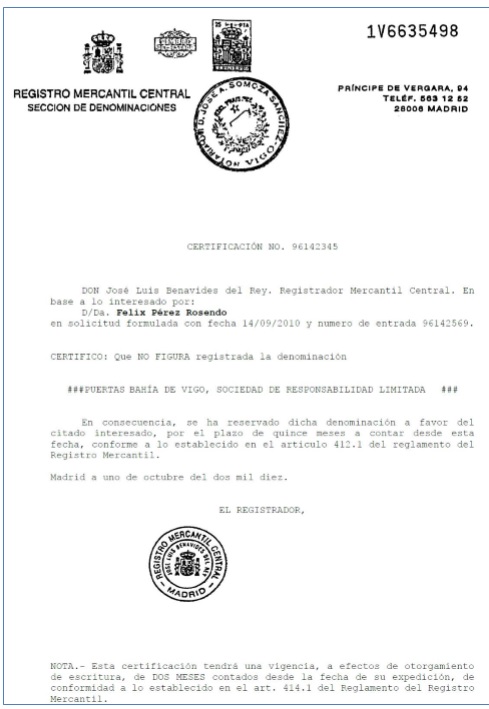 Se trata de un requisito indispensable a la hora de elevar a público la escritura de constitución. Consiste en la obtención de un certificado acreditativo de que la denominación de la Sociedad no es idéntica a alguna de las que ya figuran incluidas en la sección de denominaciones del Registro Mercantil Central. Este certificado recogerá la expresión denominativa con la que va a ser identificada la sociedad como sujeto de derechos y obligaciones en todas sus relaciones jurídicas .