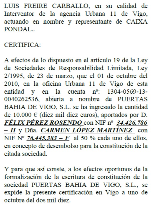 Ante el notario que autorice la escritura de constitución ha de acreditarse la realidad de las aportaciones dinerarias, mediante certificación del depósito de los correspondientes importes a nombre de la sociedad en una entidad de crédito (o mediante su entrega para que el notario lo constituya a nombre de aquélla). La certificación tiene una vigencia de 2 meses a contar de su fecha (LSC art.62).