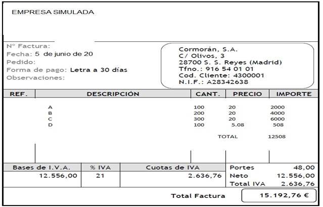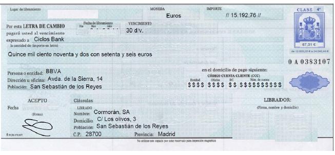 Elabora la factura. El cliente acepta la letra por el importe de la factura correspondiente.  Cumplimenta la letra.