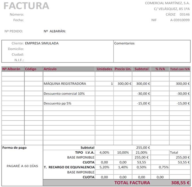 Se recibe de comercial Martínez S.A.  la factura de la compra de la máquina REGISTRADORA          300     EUROS   Se pagarán en 60 días.    Contabiliza la factura y confecciona el cheque.