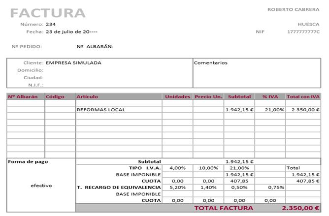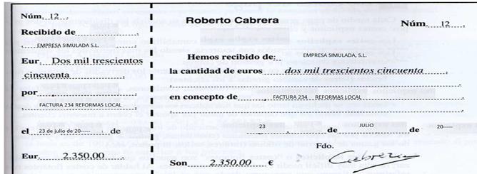 Las reformas en el establecimiento llevadas a cabo por Roberto Cabrera, llevan consigo unos costes de 2350 euros según la factura adjunta, se procede al pago en efectivo,  emitiendo la empresa Roberto Cabrera el siguiente Recibo de la transacción.