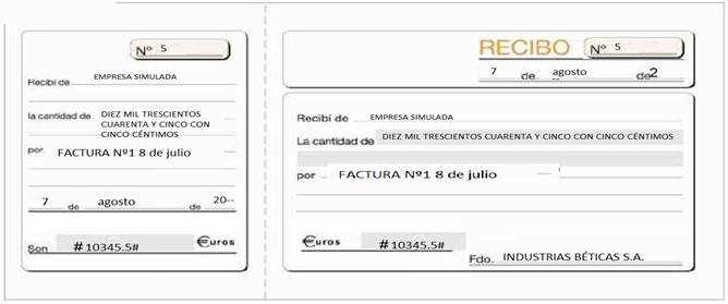 Se presenta al cobro la letra de cambio emitida el día 8 de julio. Se procede al pago en efectivo, cumplimentando el recibo correspondiente.