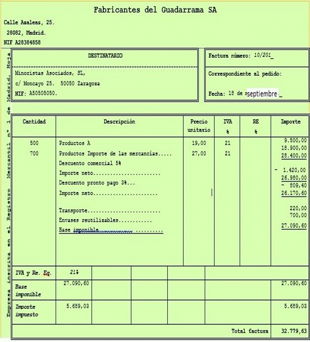 Realiza la factura de la venta a Minoristas Asociados SL, de Zaragoza   según el ejemplo adjunto, con fecha 18 de septiembre, teniendo en cuenta el cambio en la cantidad del Producto B.
