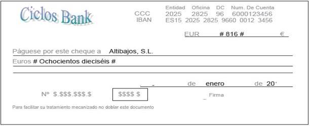 Cumplimente el cheque correspondiente conforme al ejemplo siguiente