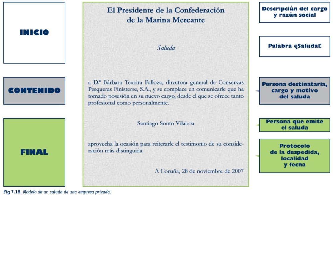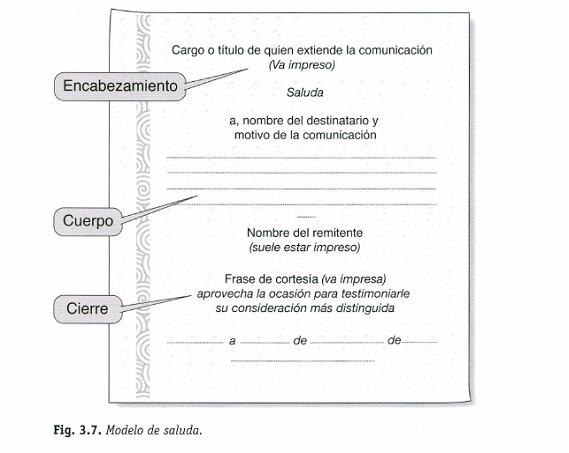 1. Encabezamiento: cargo o título de la persona que lo realiza, y a continuación, la palabra «Saluda».