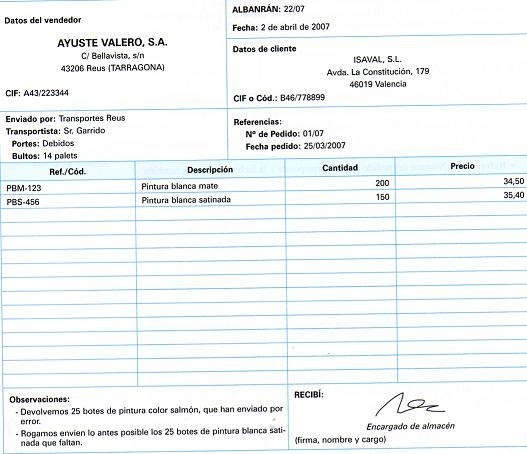 Al cotejar la mercancía se observa que han enviado 25 botes de pintura color salmón en lugar de la blanca satinada. Se hace constar en el albarán la devolución de las mercancías no solicitadas, reclamando al mismo tiempo los botes que faltan.