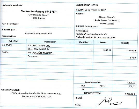 Don Alfonso Chamón (NIF 24.540.720 M) adquiere, el día 20 de marzo, un equipo de aire acondicionado en “Electrodomésticos MASTER” El vendedor expide el albarán valorado nº 307/07 como justificante de compra y pago, detallando en el mismo las condiciones de las operación y el IVA correspondiente.