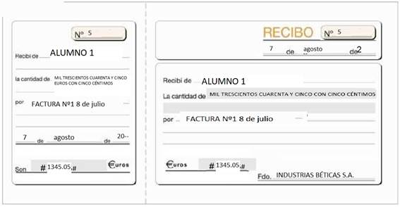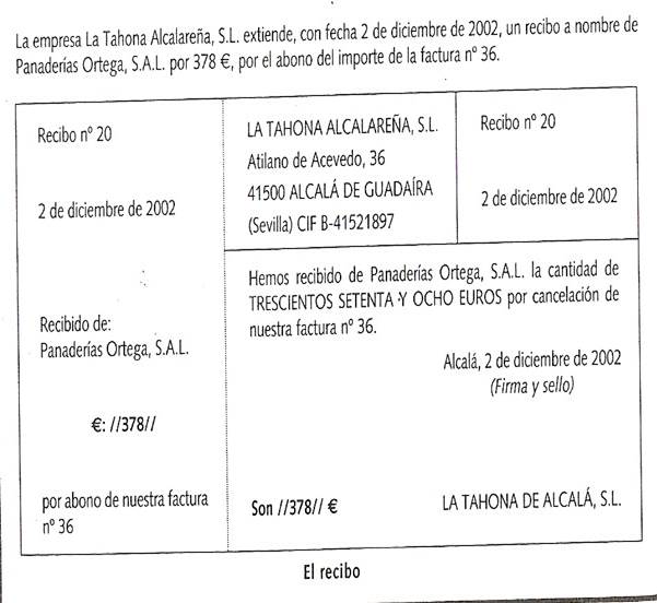 1. La empresa Norte S.A. domiciliada en la calle Alondra 56, 28015 Madrid, CIF A28853612 extiende un recibo con el número 217 a nombre de Comercial Ruiz S.A. por 187.053  €. en concepto de cancelación de la factura nº 456, de fecha 5 de marzo de 1999.