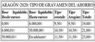Tipos IRPF en 2019 de España comparados por Comunidades Autónomas. Imagen de la guía de fiscalidad y tributación de los productos financieros de Invierto y AhorroTabla de tramos IRPF estatal, autonómico y combinado en AragónTabla de tramos IRPF Aragón  parte se rige por una escala estatal y la otra parte por la escala autonómica. La combinación de ambas dan lugar a la tabla de tramos final para la comunidad aragonesa.