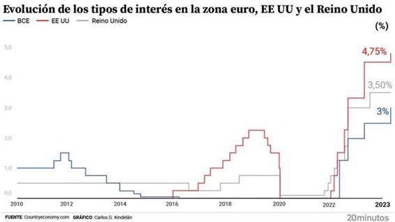 Evolución de los tipos de interés en la zona euro, EEUU y el Reino Unido.