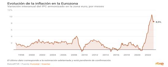 Esta es la sexta subida de tipos por parte del BCE, que mantiene su hoja de ruta para lograr reducir la inflación al entorno del 2%, un objetivo que todavía está lejos del 8,5% alcanzado en febrero, según datos de Eurostat. Teniendo en cuenta las subidas acometidas hasta ahora, el BCE ha elevado el precio del dinero en 350 puntos básicos.