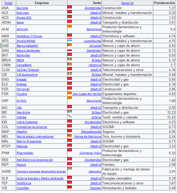 IBEX 35 Este índice es ponderado por capitalización y lo componen las 35 compañías más líquidas que cotizan en la Bolsa española. Dentro de Europa, la capitalización de la Bolsa española supera a la italiana y está por debajo de la británica, alemana, francesa, suiza y sueca. Los 35 del Ibex representaban el 90% del efectivo negociado en la Bolsa española. El valor de capitalización de los valores del IBEX 35 a 31 de marzo de 2021 era de 574 153 millones de euros.