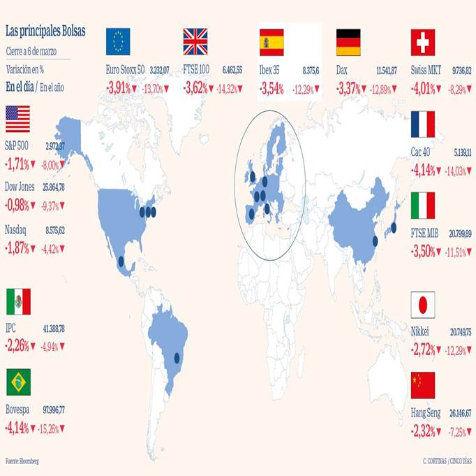 El crash del coronavirus hace que el Ibex 35 sufra la segunda peor semana de su historia: pierde un 20,8% hasta los 6.630 puntos 13/03/2020