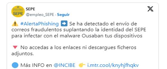 El Instituto Nacional de Seguridad (INCIBE) ha alertado junto a la Guardia Civil de una nueva campaña de malware que intenta suplantar al Servicio Público de Empleo (SEPE) con el envío de una notificación al correo electrónico de un supuesto proceso laboral. El correo fraudulento contiene un enlace para que la víctima descargue un PDF informativo con un archivo malicioso que infecta a los dispositivos electrónicos.