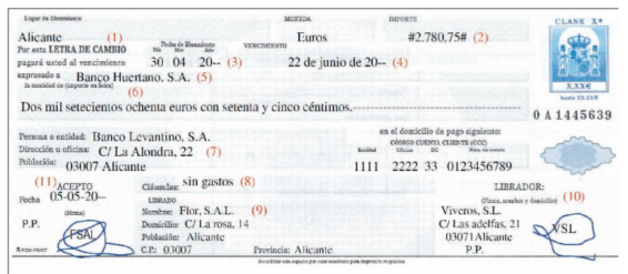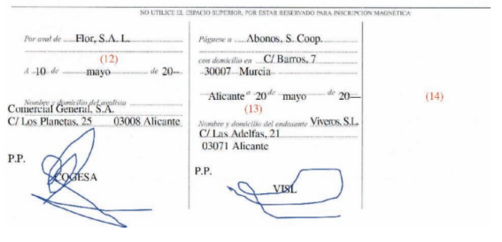b) Viveros, S.L. envía, junto con la factura, a Flor, S.A.L. la letra para su aceptación y domiciliación bancaria, haciendo la posterior remisión de la misma e incluyendo un aval. Los datos necesarios para la cumplimentación son: