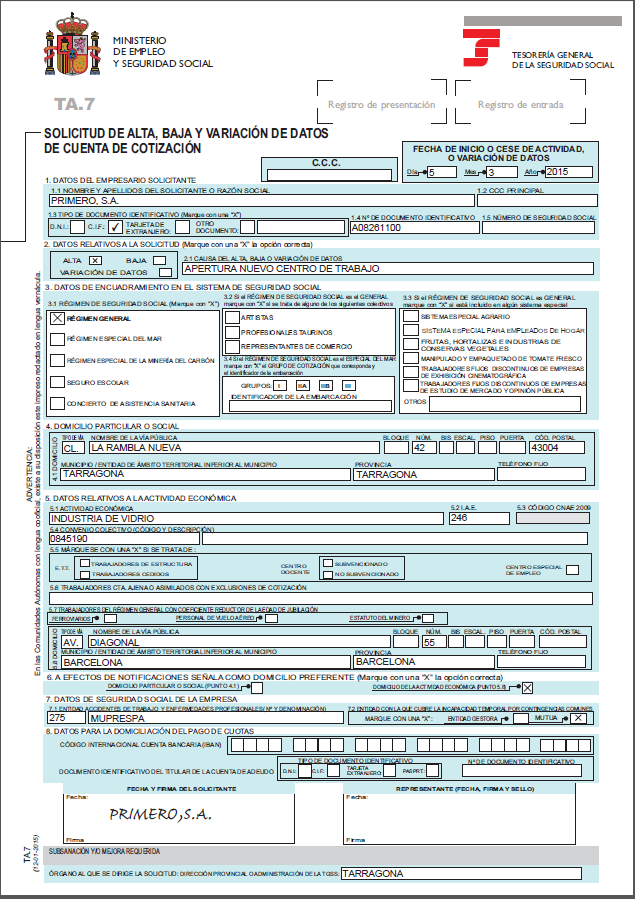 Da de Alta tu empresa en la Seguridad Social siguiendo el ejemplo anterior:
