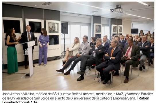 De Vilchez ha remarcado que BSH, Universidad de San Jorge y Maz fueron "visionarios" al crear esta Cátedra de Empresa Sana porque hace diez años el número de procesos con baja en España era de unos 4 millones y una afiliación media a la Seguridad Social de 16 millones de trabajadores mientras diez años más tarde, hemos tenido 9,2 millones de bajas con una afiliación media de 20,6 millones, es decir, la afiliación ha subido un 25% y las bajas han subido un 125%".