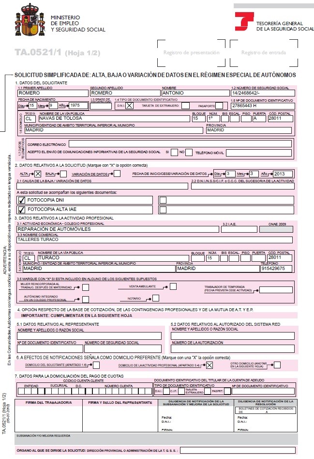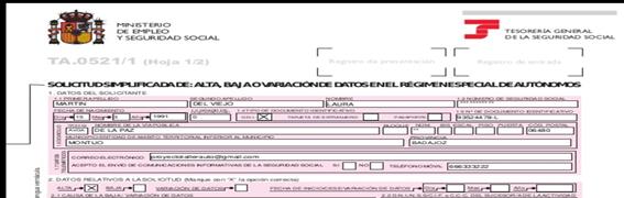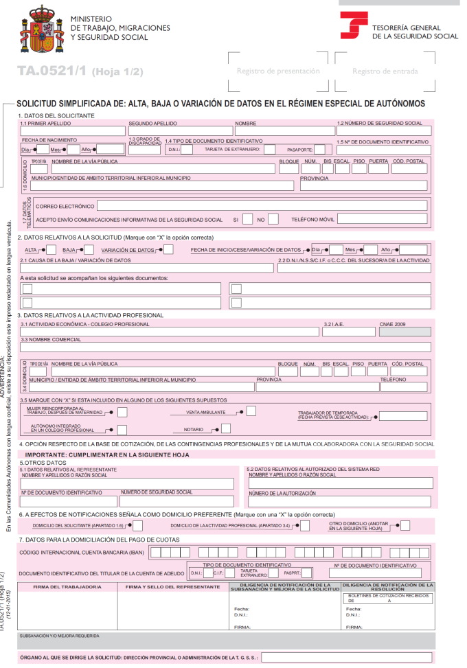 Dentro de los impresos necesarios para el trabajador autónomo, el modelo TA.0521 es la Solicitud de alta , baja o variación de datos en el Régimen Especial de autónomos. Existen diferentes v