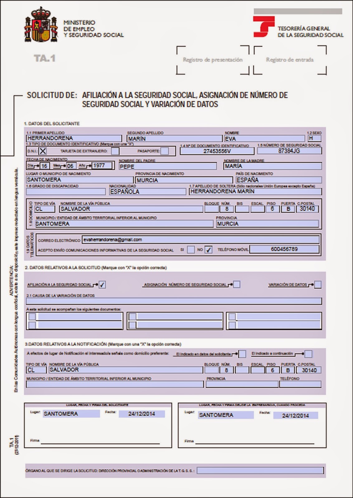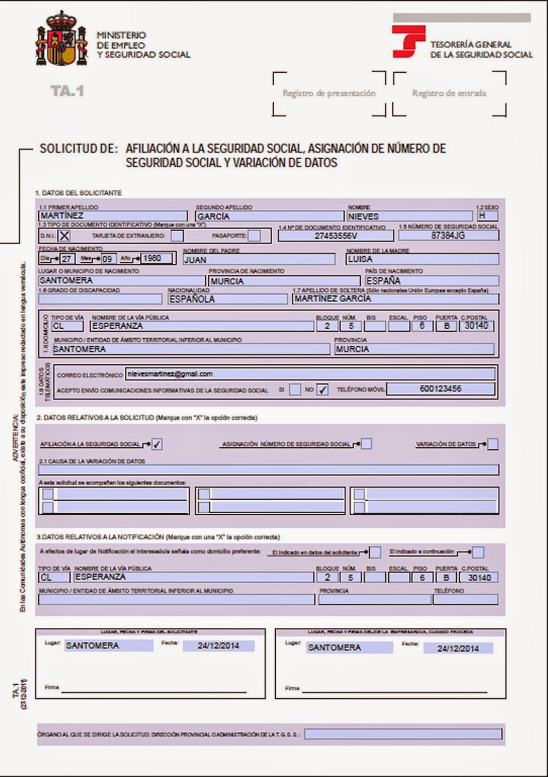 Modelo TA1 de afiliación a la Seguridad Social