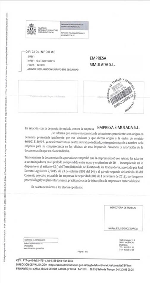 - Se recibe la siguiente Acta de Inspección de trabajo: