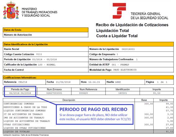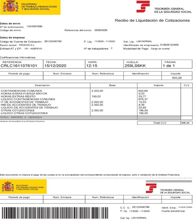 Por su lado, el RLC (antiguo TC1) muestra el pago realizado por la empresa de la cotización mensual a la Seguridad Social y también debe incluir un listado de todos los trabajadores que hayan liquidado durante el periodo. El documento necesita de una huella electrónica que asegura la autenticidad del documento.