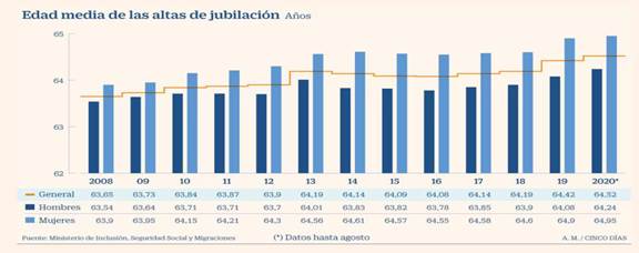 Los últimos datos oficiales indican que en agosto pasado la edad media de las nuevas jubilaciones era de 64,5 años (64,24 años para los hombres y 64,95 años para las mujeres). Según se indica en la documentación presupuestaria para 2021, esta edad media es “inferior en un año a los 65 años y diez meses, establecidos como la edad legal en 2020”. Y si se mantiene este ritmo, en ausencia de nuevas reformas, esta brecha seguirá incrementándose, ya que la edad media de retiro avanza más lentamente que la edad ordinaria de jubilación.