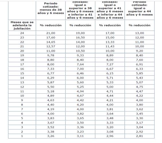 De esta forma, la reducción de la pensión por jubilación anticipada voluntaria puede ser desde un 2,81% (en el mejor de los casos) cuando se anticipe la jubilación un año y se haya cotizado 44 años y seis meses hasta el 21% (en el peor de los casos) para quien adelante la jubilación 24 meses y haya cotizado menos de 38 años y seis meses.